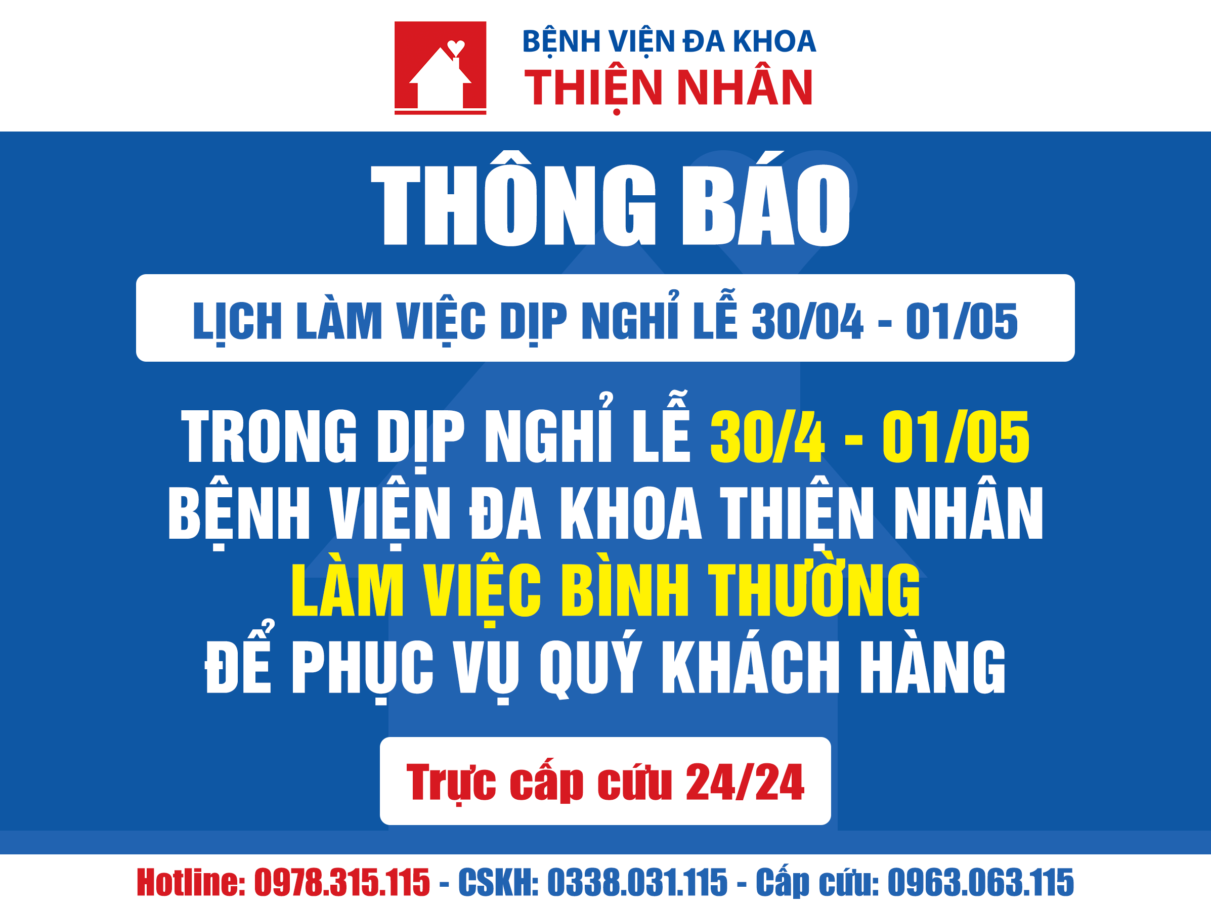 Nhằm đáp ứng nhu cầu khám, chữa bệnh của Quý khách hàng trong dịp nghỉ lễ 30/04 - 01/05, Bệnh viện Đa khoa Thiện Nhân xin trân trọng thông báo:
